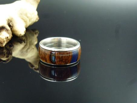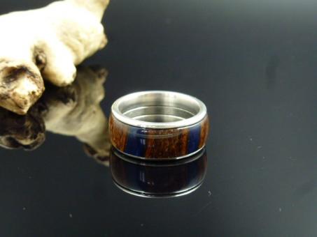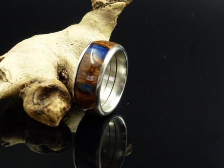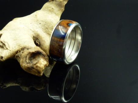 Dieser handgedrechselte Ring ist aus Edelstahl mit Banksiazapfen. Die Hohlräume der Samenkammern wurden mit Kunstharz "Blau" ausgegossen.