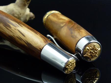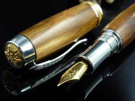 Bei diesem Füller handelt es sich um einen absoluten Edelfüller. Er ist mit hochwertigen Metallen in diesem Fall Rhodium beschichtet und die handgegossenen Gravuren sind mit 22k Gold beschichtet.